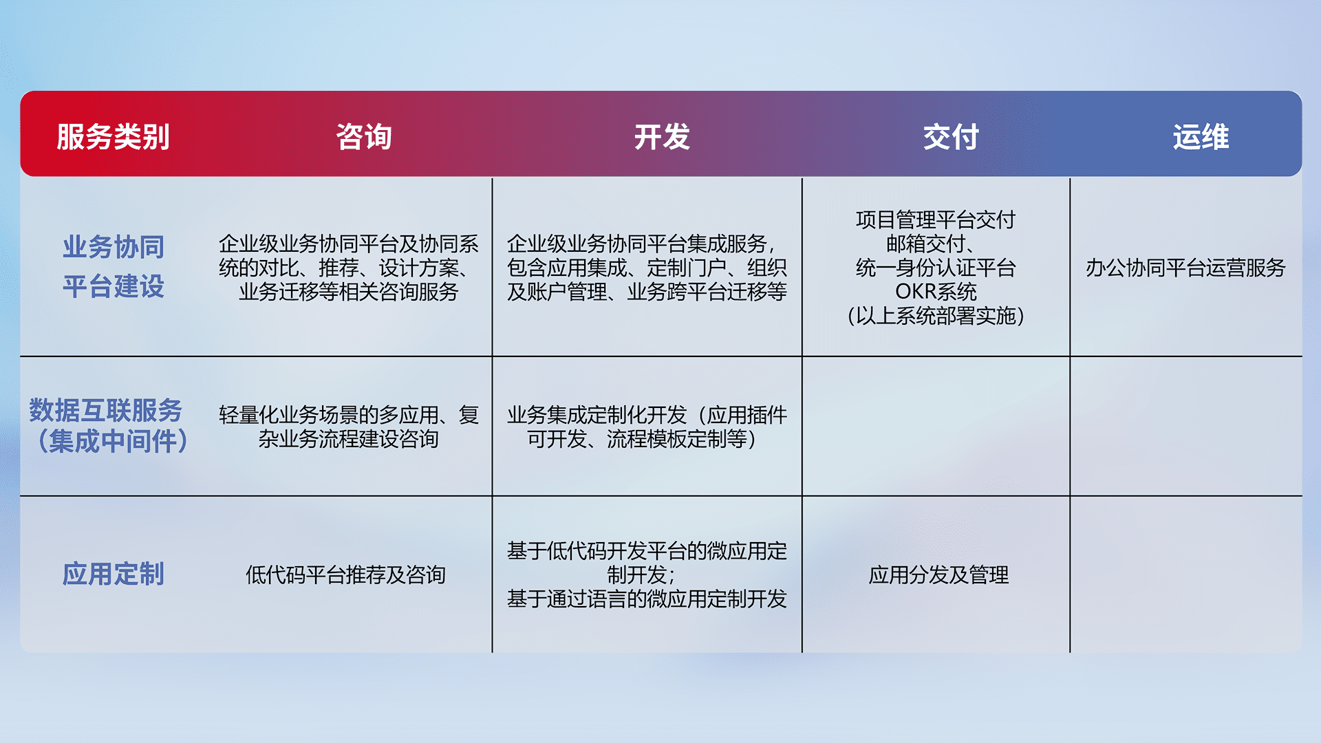 针对钉钉、、企微、、IDaas等平台级产品提供产品的规划、、方案、、交付、、、定制化开发等服务,,实现如统一协同办公、、、智能客户服务、、、混合会议管理、、、、智能数据查询、、、等业务场景,,实现数字化转型。。。。