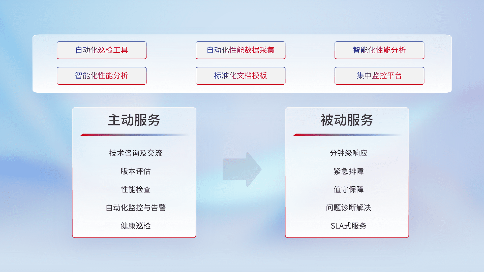 智能化工具和标准化文档,,,保障服务质量,,提供主动服务(包含技术咨询、、、、版本评估、、、、性能检查、、、自动化监控与告警、、健康巡检)和被动服务包含(分钟级响应、、紧急排障、、、、值守保障、、、问题诊断解决、、、、SLA服务)。。