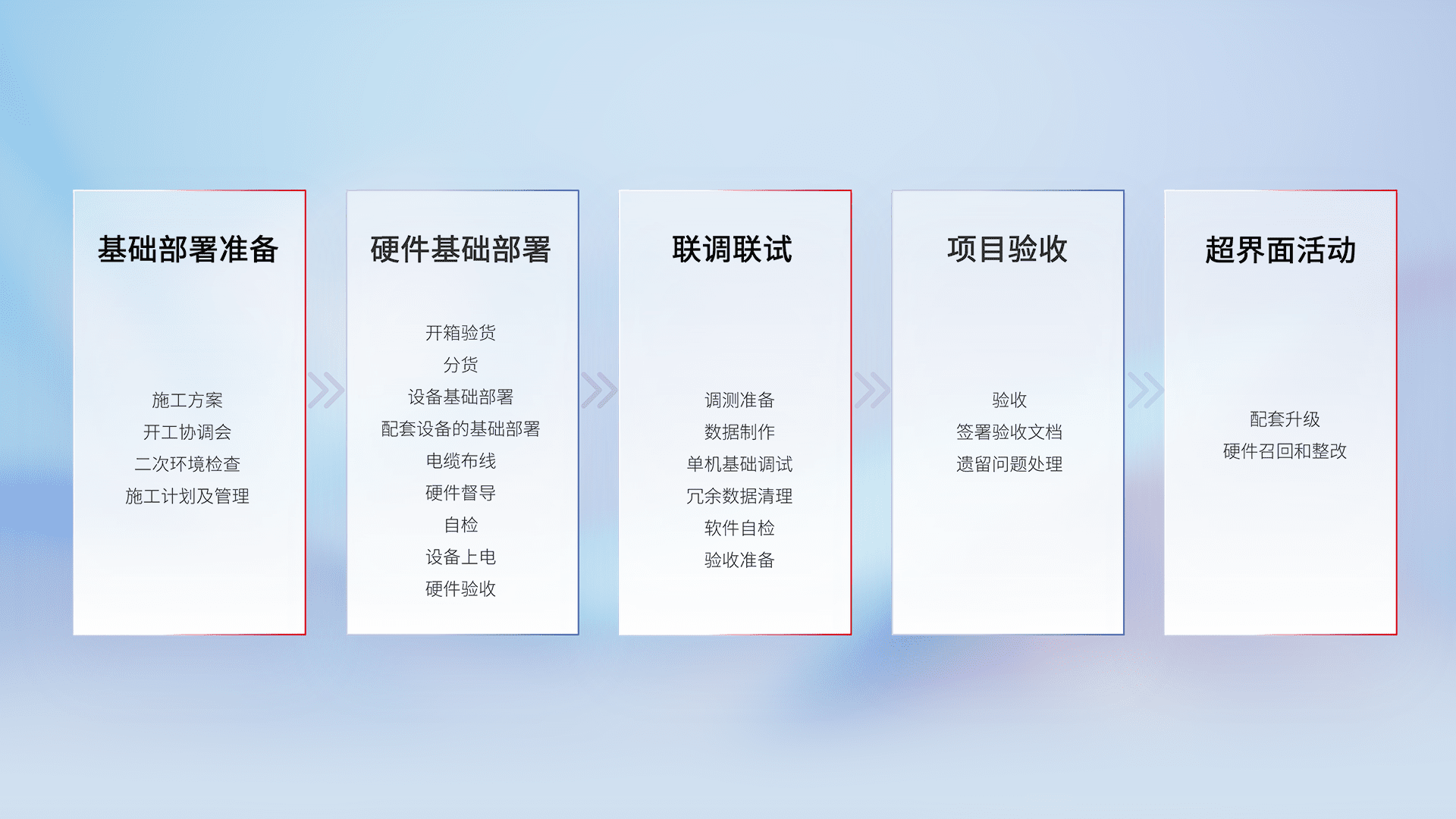 从基础部署准备、、、硬件基础部署、、联调联试、、、项目验收、、越界面活动的全过程可追溯,,,,保证施工质量和进度。。